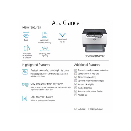 | What’s in the box | HP LaserJet Pro M209dw Printer HP Black LaserJet Toner Cartridge(~700 pages) Dust Cover Reference Guide, Setup Poster, Warranty Guide & Flyer in some countries Power cord |