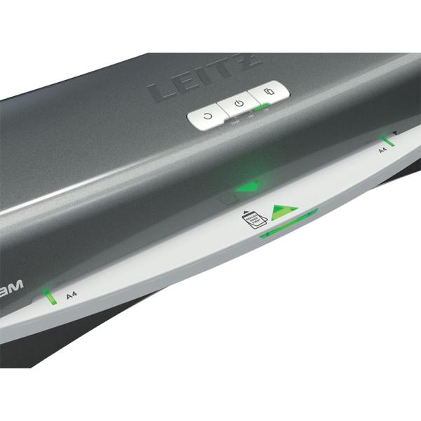 Contemporary and compact, the Leitz iLAM Office laminating machine seamlessly integrates style and efficiency. This A4 laminator offers effortless lamination, featuring a fast 1-minute warm-up time and the ability to laminate an 80-micron A4 sheet in just 36 seconds, ensuring quick and easy document protection. The intuitive touch panel provides three pouch thickness settings for versatile use, along with an anti-jam reverse button for smooth removal of misfed pouches. The innovative SMART status LED uses lights and sounds: red during warm-up, green with an audible signal when ready, and flashing red for auto shut-off after 15 minutes of inactivity. Additionally, the SMART entry guide LEDs ensure perfect pouch alignment to prevent jams. Grey and white colour.