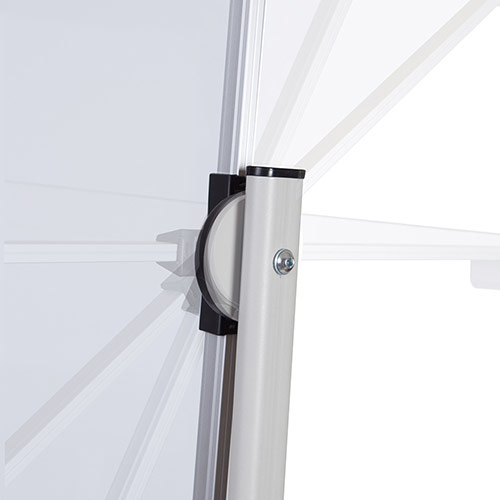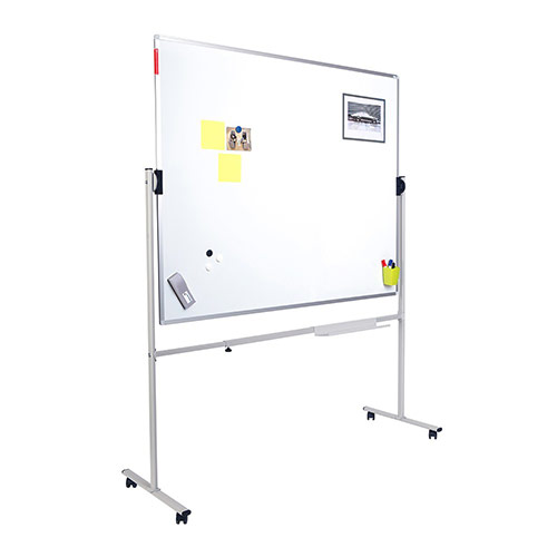 Revolving mobile stand. Includes a new FREE ROTATION system unique in the market that allows to safely turn the whiteboard when changing sides and prevents rocking while writing. The adjustable support allows whiteboard from 120cm to 200cm. Includes a tray and wheels with brake system. Easy-to-assemble. Board not included.